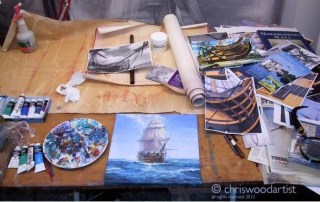 On the stand beside Julie, is the highly accomplished painter Chris Wood (chriswoodartist.com/). His marine themes are richly coloured. “I love the dichotomy between the beauty of ships and the fact that they are killing machines,” he explains. “I have always appreciated the aesthetics of boats, but there is a psychological difference between military and leisure boats.”