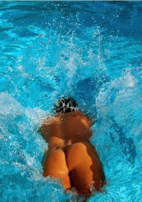 “I like my photographs to look more like paintings than photographs,” he says and explains that he can see the appeal of technical detailed photography such as spider web close ups, but doesn’t think that’s the sort of thing people want on their wall. He has recently started doing abstract work such as nudes and pedestrian crossings. I am particularly taken by two of his photos: one is a close up of a Patisserie door. It has a warm summery hue, the wood is interesting looking. The other is this photograph (see left). “I’m a Yorkshire man like David Hockney” he chuckles. “That’s my bum jumping into the pool. I had a tripod and took half a dozen shots. I call it An Even Bigger Splash. I’m impressed. There are three other photographers exhibiting, each with very different styles and tones: